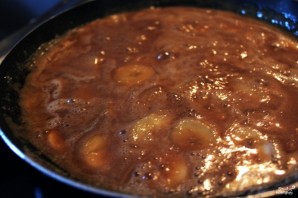 В соус к маслу и кленовому сиропу нужно отправить коричневый сахар. Поставьте огонь на минимум и дождитесь, пока сахар растворится. Затем влейте сливки, перемешайте. Последним в сковороду закладывается банан. Следите, чтобы бананы были полностью покрыты соусом. Протушите соус ещё 5 минут — и он готов.