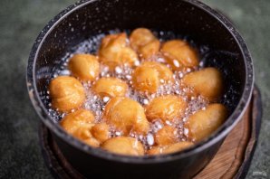 В сотейнике разогрейте на среднем огне обильное количество растительного масла и партиями выкладывайте шарики теста. Обжаривайте со всех сторон до аппетитного золотистого оттенка.