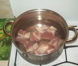 Для приготовления лучше взять грудинку, бульон будет наваристее. Нарезаем мясо на куски, промываем и выкладываем в кастрюлю. Заливаем водой и ставим вариться.