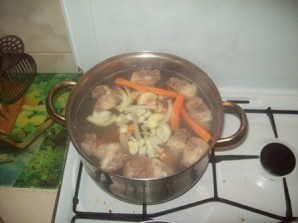 Очищаем морковку и лук. Морковь разрезаем на несколько частей, луковицу надрезаем. Как только мясо закипит, снимаем пенку и добавляем в кастрюлю овощи. Закрываем кастрюлю крышкой, уменьшаем огонь и варим до готовности мяса. Примерно часа 2. В конце варки можно добавим соль и молотый перец.