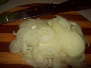 Готовое тесто отправляем в холодильник минут на 30, а пока почистим и нарежем лук.