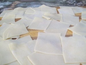 Нарезаем пласты теста на ромбики или квадратики. Размер - 5-7 см. Оставляем на столе , пусть подсыхают.