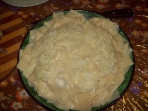 В кипящем бульоне варим 5-7 минут кусочки теста и выкладываем их на большое блюдо. Посыпаем сверху луком.