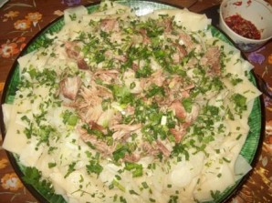 Затем выкладываем мясо и посыпаем рубленной зеленью. Еще можно сделать острый соус для бешбармака. Смешать мелко порубленный чеснок, перец чили и добавить столовую ложку уксуса и соевого соуса. Очень вкусно:)