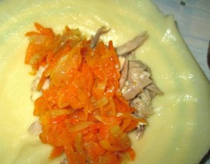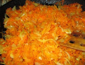 На сковороде разогрейте растительное масло, добавьте порезанный кольцами лук и натертую морковь. Обжариваем овощи до готовности, помешивая.