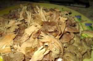 Приготовленную курицу извлекаем из бульона и отделяем мясо от костей.
