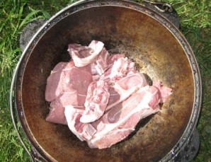 Для начала мы очищаем мясо от пленочек и жил, тщательно промываем его и выкладываем мясо в казан.