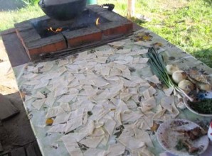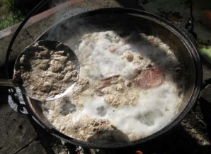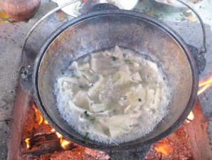 Постоянно помешивая кипящий бульон, выкладываем в казан ромбики лапши.