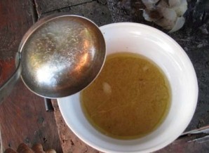 Теперь мы открываем казан и половником снимаем с поверхности образовавшийся жир, переливаем его в отдельную миску, всего необходимо 1,5-2 стакана.