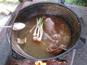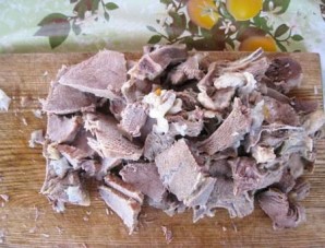 Затем шумовкой извлекаем из казана мясо, лук, морковь и чеснок, отделяем мясо от кости и нарезаем его на кусочки поперек волокон.
