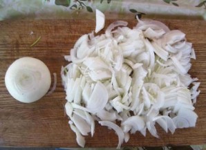 Потом нарезаем репчатый лук полукольцами, оставляем целой только пол луковицы.