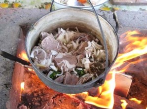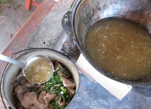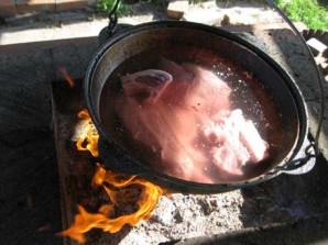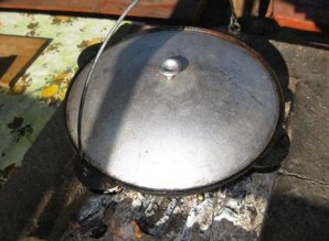 Теперь можно закрыть казан крышкой и варить мясо на медленном огне в течение двух часов.