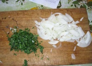 Далее нарезаем полукольцами оставшуюся половину луковицы, измельчаем зелень.