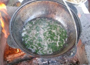 Нарезанный лук перекладываем в кастрюлю, добавляем к нему мясо, часть свежей зелени, стебли чеснока, молотый перец и заливаем бульон так, чтобы он прикрывал содержимое кастрюли наполовину.