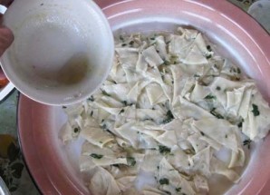 Варим ее 3-5 минут, а затем перекладываем лапшу на широкое блюдо, поливаем ее предварительно отлитым жиром из казана, посыпаем лапшу нарезанной зеленью, черемшой и молотым черным перцем.