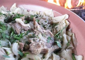 Рецепт не отнимет много времени. Сразу хочу предупредить, что рецепт приготовления бешбармака в казане не так прост, как это может показаться на первый взгляд, и весь процесс займет не мало времени. Однако это блюдо стоит всех потраченных на него сил, ведь оно получается просто невероятным, мясо в бешбармаке очень нежное и прямо тает во рту, а лапша отлично его дополняет. Кстати, бешбармак в казане в домашних условиях тоже можно сделать, правда, казан для этого лучше подобрать меньшего размера Подавайте горячим.