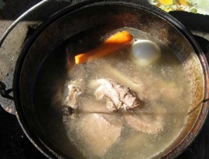 После того как пена перестанет появляться, кидаем в воду очищенную луковицу и морковь.