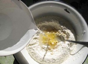 Ну а пока мясо кипит, мы можем приготовить лапшу, для этого насыпаем в миску муку, добавляем яйца, соль и вливаем теплую воду.