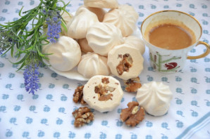 Рецепт не отнимет много времени. Если не хотите печь банальное безе, приготовьте его с начинкой внутри. Это гораздо вкуснее и интереснее на вкус. Смотрите пошаговый рецепт, в котором даны все необходимые рекомендации. Из данного количества ингредиентов получается до 20 штук безе в зависимости от размеров Подавайте охлаждённым.