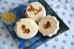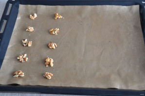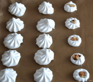 Начинку в безе можно ввести двумя способами. Первый способ — разложить орехи на расстоянии и сверху отсадить на них взбитую белковую массу.