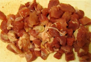 Мясо промываем, просушиваем и нарезаем одинаковыми кубиками.