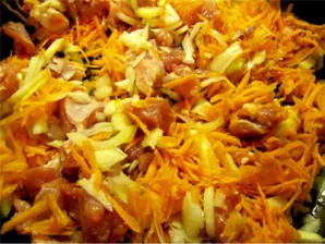 Сотейник разогреваем, наливаем масло. На сильном огне обжариваем мясо до корочки, затем добавляем морковь и лику, перемешиваем, накрываем крышкой и немного тушим на среднем огне.