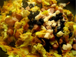 Копчености и чернослив добавляем на сковородку, обжариваем, перемешивая.