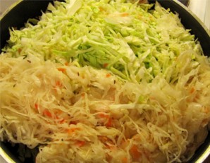 Через пару минут выкладываем нашинкованную капусту и квашенную капусту.