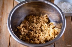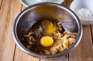 Вбейте к тертому баклажану яйца, добавьте соль и перец черный молотый. Перемешайте все.