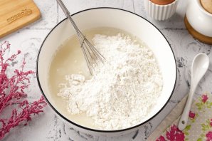 Затем добавьте муку. Если хотите блины с дырочками, то можно добавить соду или разрыхлитель.