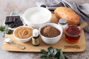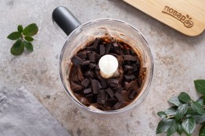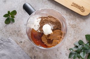 Добавьте кленовый сироп, разрыхлитель, щепотку соли, муку, ванильный ароматизатор, миндальную пасту и какао-порошок. Еще раз измельчите до однородности. Тесто должно получиться густым, но если оно совсем тугое и «пластилиновое», то допустимо добавить немного воды или молока, чтобы сделать консистенцию более подходящей.