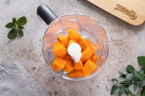 После остудите и очистите батат от кожуры и измельчите батат в блендере до однородного пюре.