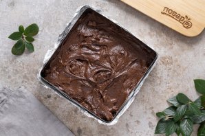 Выложите получившееся тесто в форму для выпечки. Я использую квадратную кондитерскую форму, а дно выстилаю пергаментом с фольгой. Выпекайте 40-50 минут. У брауни должна подхватиться верхушка, а внутри он останется влажным.
