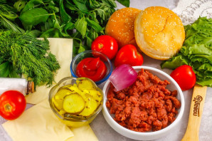 Подготовьте указанные ингредиенты. Говяжий фарш приобретите в магазине или приготовьте сами из качественной говядины и кусочка свиного сала.