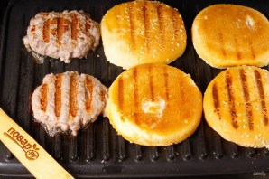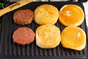 Электрогриль разогрейте и смажьте его панели растительным маслом. Выложите на них котлеты и булочки, разрезанные пополам.