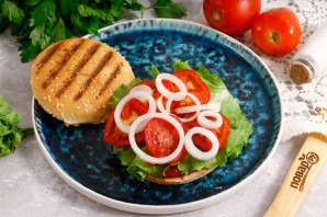 Промойте листья салата и выложите на соус, промойте помидоры и нарежьте их колечками, вырезая сердцевинки. Очистите лук, промойте и нарежьте кружочками. Выложите нарезки томатов и лука на бургер.