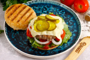 Накройте бургер верхушкой булочки и закрепите деревянной шпажкой. Подайте к столу горячим.