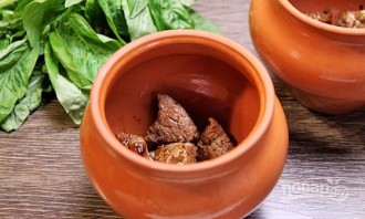 Теперь перекладывайте ингредиенты в горшочки, хватит на 4 штуки. Первым слоем уложите мясо. Посолите его.