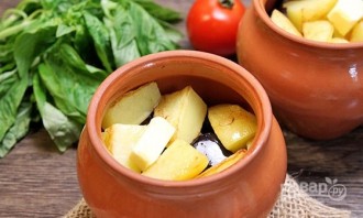 Потом выложите баклажаны, картофель и ещё кусочек масла.