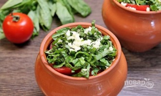 Сверху засыпьте соль и приправы. Нарежьте зелень и чеснок.