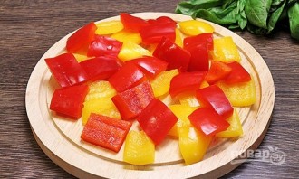 Из перца удалите семечки, перепонки и плодоножки. Плоды нарежьте крупными квадратиками.