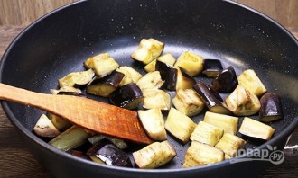 Разогрейте масло на сковороде. Обжарьте на нём баклажаны.