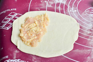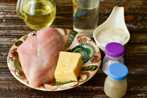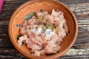 Куриную грудку перекрутите на мясорубке. Добавьте в фарш соль и перец черный молотый. Хорошо его перемешайте.