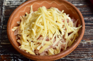 Затем добавьте в фарш тертый на крупной терке твердый сыр. Снова все тщательно перемешайте.