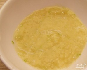 3. Возьмите подсолнечное масло и постепенно добавляйте его к растертому с солью чесноку. После каждой маленькой порции масла тщательно перетирайте массу. Постепенно получится чесночно-масляная эмульсия.