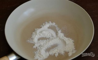 Поставьте на плиту сковороду с антипригарным покрытием. Разогрейте ее и всыпьте столовую ложку пшеничной муки высшего сорта. Обжарьте муку, чтобы она стала золотистой.