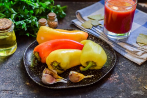 Перцы вымойте и просушите, очистите от семян. Каждый перец разрежьте пополам, после нарежьте крупными полосками.