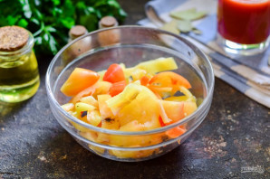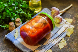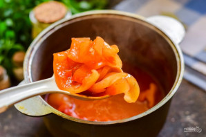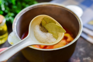 Добавьте следом к перцам соль, сахар, лавровый лист и щепотку молотого перца.