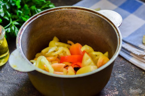 Влейте в кастрюлю с перцами растительное масло.