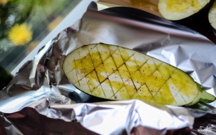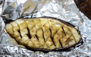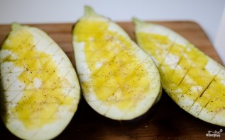 Помойте баклажаны и разрежьте их на две половинки. Ножом сделаете глубокие разрезы на мякоти баклажан. Посолите, поперчите и полейте 1-2 ст. ложкой оливкового масла.